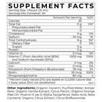 Other Ingredients: Organic Glycerin, Purified Water, Phosphatidylcholine, Potassium Bicarbonate, Konjac Root, Organic Vanilla Extract, Organic Orange Peel Oil, Vitamin E (as D-Alpha Tocopherol), Malic Acid, Beta Carotene, Organic Citrus Extract, Citrus Bioflavonoids.