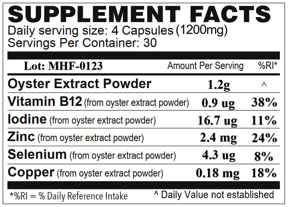 OysterMax® oyster supplement is a highly potent extract powder. Each bottle of oyster extract capsules contains on average the concentrated extract of approximately 6 kg of fresh oysters.
