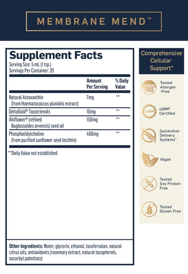 Membrane Mend™ is a daily formula designed to promote cellular health by fortifying cell membranes, often referred to as "the brain of the cell." This powerful blend includes phosphatidylcholine (PC), vitamin E, and astaxanthin, working together to enhance membrane integrity and repair. The high-grade PC and Ahiflower® fatty acid complex support healthy energy production while protecting against oxidative threats. Additionally, the formula's antioxidants help balance inflammation within cells, contributing to cellular longevity and ensuring that mitochondria—the energy powerhouses of cells—function optimally.